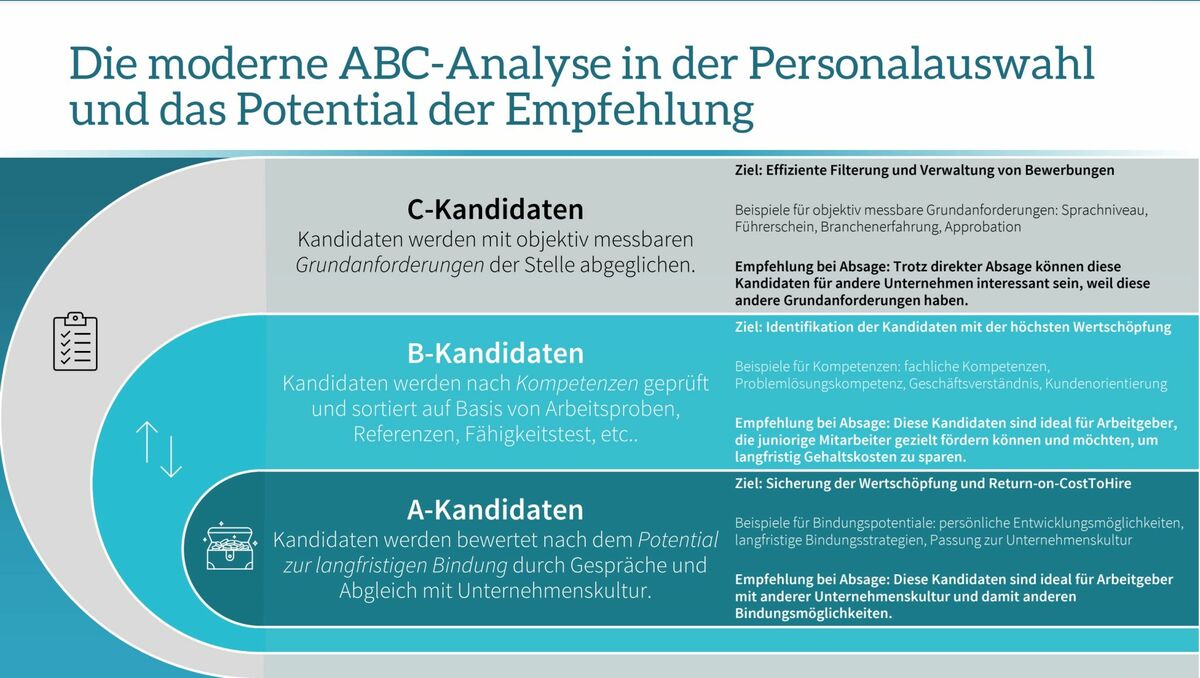 Die Grafik "Die moderne ABC-Analyse in der Personalauswahl und das Potential der Empfehlung" stellt ein Konzept zur Klassifizierung von Bewerbern in drei Kategorien vor: A-, B-, und C-Kandidaten, jeweils definiert durch unterschiedliche Qualitäts- und Potentialmerkmale.