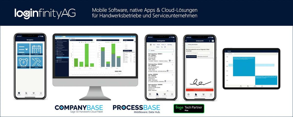 Dann komm zur Loginfinity AG – einem innovativen Hersteller von mobiler Software, Apps und Cloud-Lösungen für Handwerksbetriebe und Serviceunternehmen. Als Tech-Partner Plus der Sage GmbH haben wir das Handwerker Cloud Paket für die Branchenlösung Sage 50 Handwerk entwickelt.