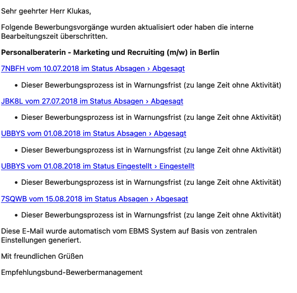 Alle Teilnehmenden im EBMS können einstellen, dass man keine sofortigen Einladungen zu Umläufen, Terminen oder dergleichen erhält, sondern nur eine tägliche Zusammenfassung. Diese wurde jetzt so erweitert, dass die Bewerbungsprozesse nach der hinterlegten Stelle gruppiert werden, sodass diese, besonders bei vielen Bewerbungen, übersichtlicher erscheint.