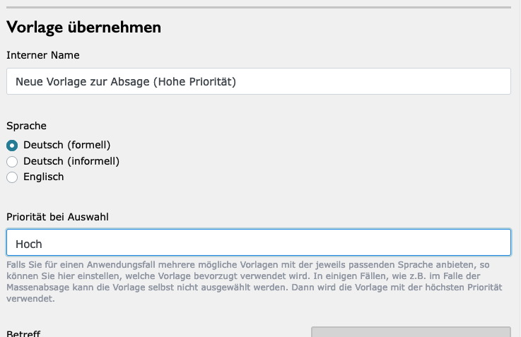- NEU: In der letzten Ebene, falls die Firma mehrere Vorlagen anbietet (z.B. Absage für Ausbildungen, Absage für Führungskräfte), kann nun die Sortierpriorität eingestellt werden. Damit könnt ihr beeinflussen, welche Vorlage immer am weitesten oben steht.
